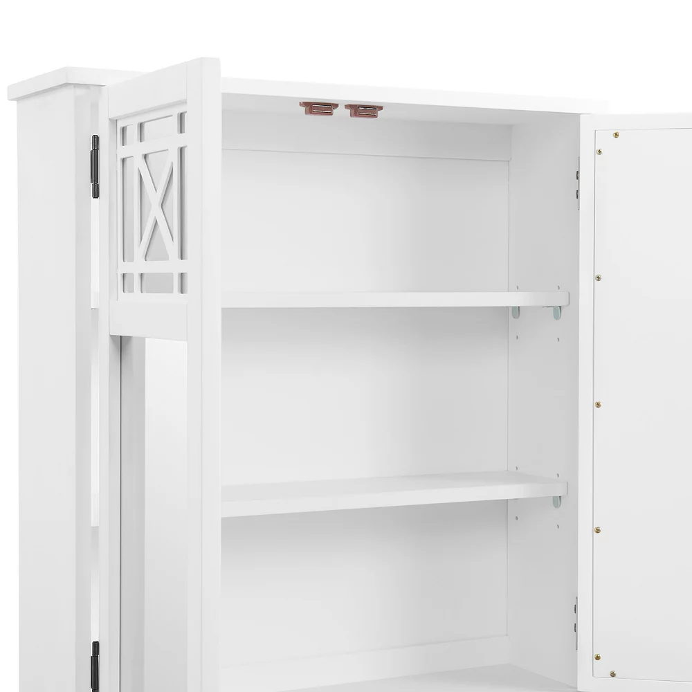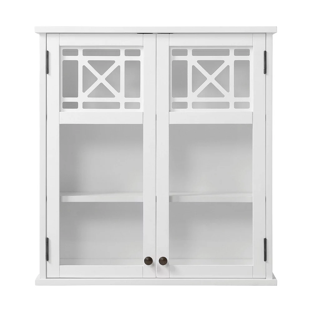 - Tempered glass doors on wall mounted cabinet conceal two adjustable shelves