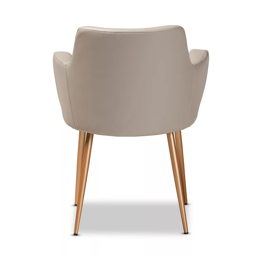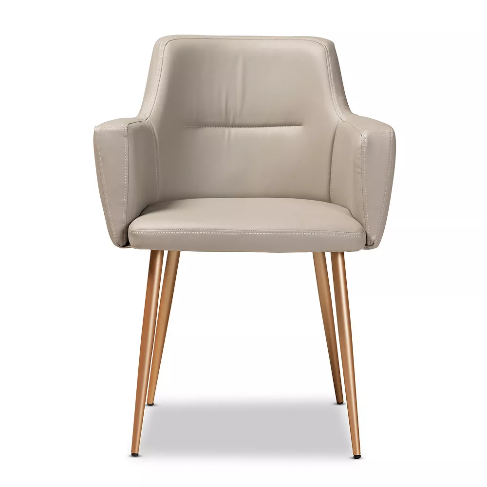 Elevate your dining room style with this luxury Baxton Studio Martine dining chair. Combine form and function with the padded armrests and gold finished metal legs.