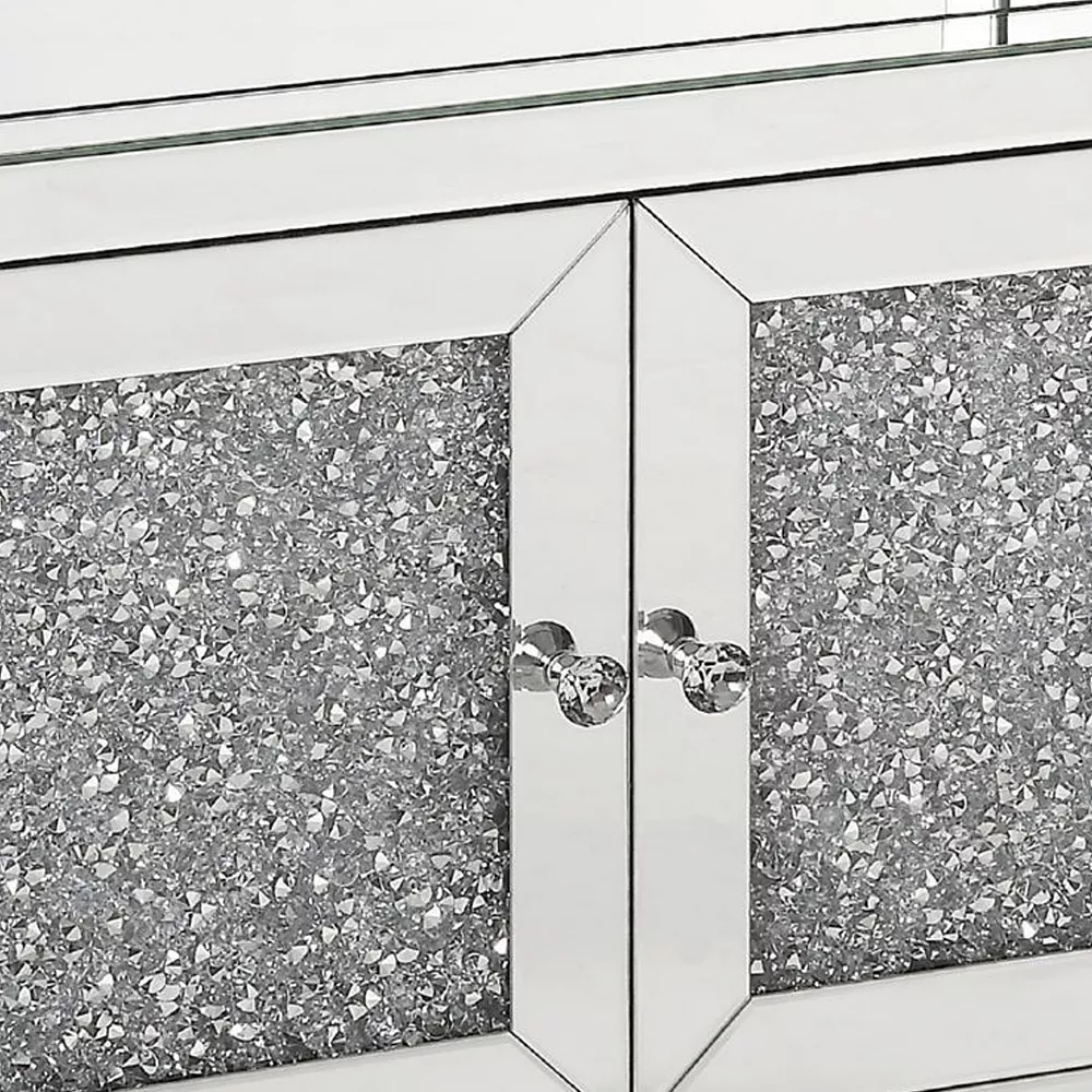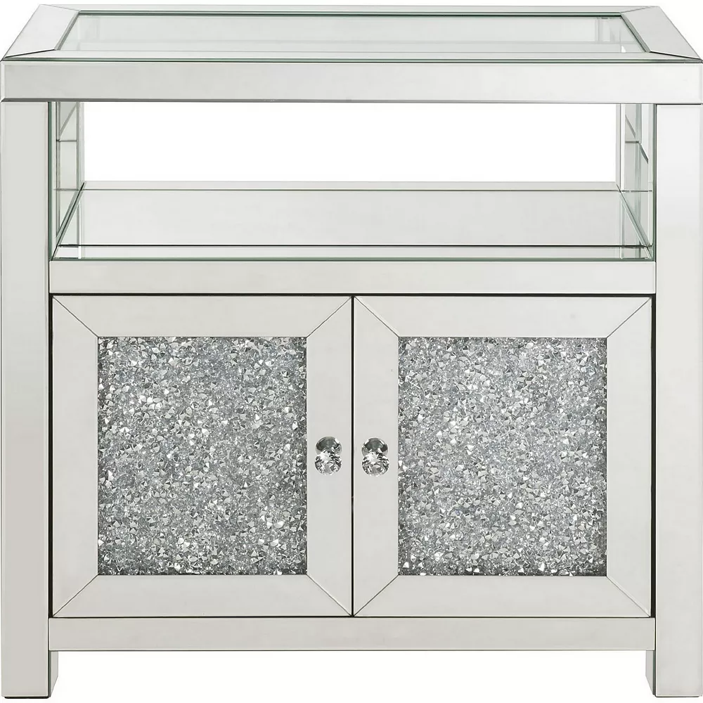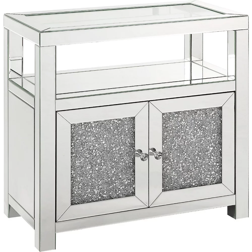 Give a distinctive makeover to your dining area with the inclusion of this sturdily constructed cabinet. This cabinet looks absolutely stunning with its charming encrusted faux acrylic diamond inlay all over the two doors. The mirrored panel inserts offer a sense of charm and aesthetic appeal. Equipped with 1 open shelf beneath the top, it provides one to store essentials.
