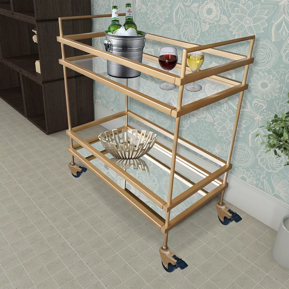 Add this modern efficient bar cart in your living space to make your serving easy while enjoying everything at your reach. The frame of this metal cart is constructed from gold finish iron while the clear mirror shelves accentuate its modern appeal. It features 4 efficient castor wheels that make it move in any direction, out of which 2 comes with a lock. It comes with 2 side handles that offer easy carrying while the rails on each shelf protect anything from falling. The distance between each shelf is spacious enough that you can use it for placing bottles along with other items.