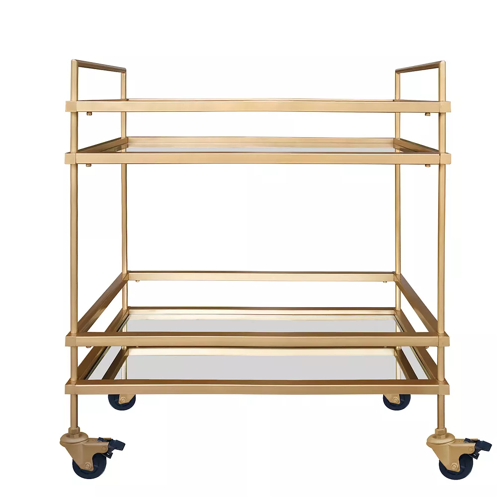 Add this modern efficient bar cart in your living space to make your serving easy while enjoying everything at your reach. The frame of this metal cart is constructed from gold finish iron while the clear mirror shelves accentuate its modern appeal. It features 4 efficient castor wheels that make it move in any direction; out of which 2 comes with a lock. It comes with 2 side handles that offer easy carrying while the rails on each shelf protect anything from falling. The distance between each shelf is spacious enough that you can use it for placing bottles along with other items.