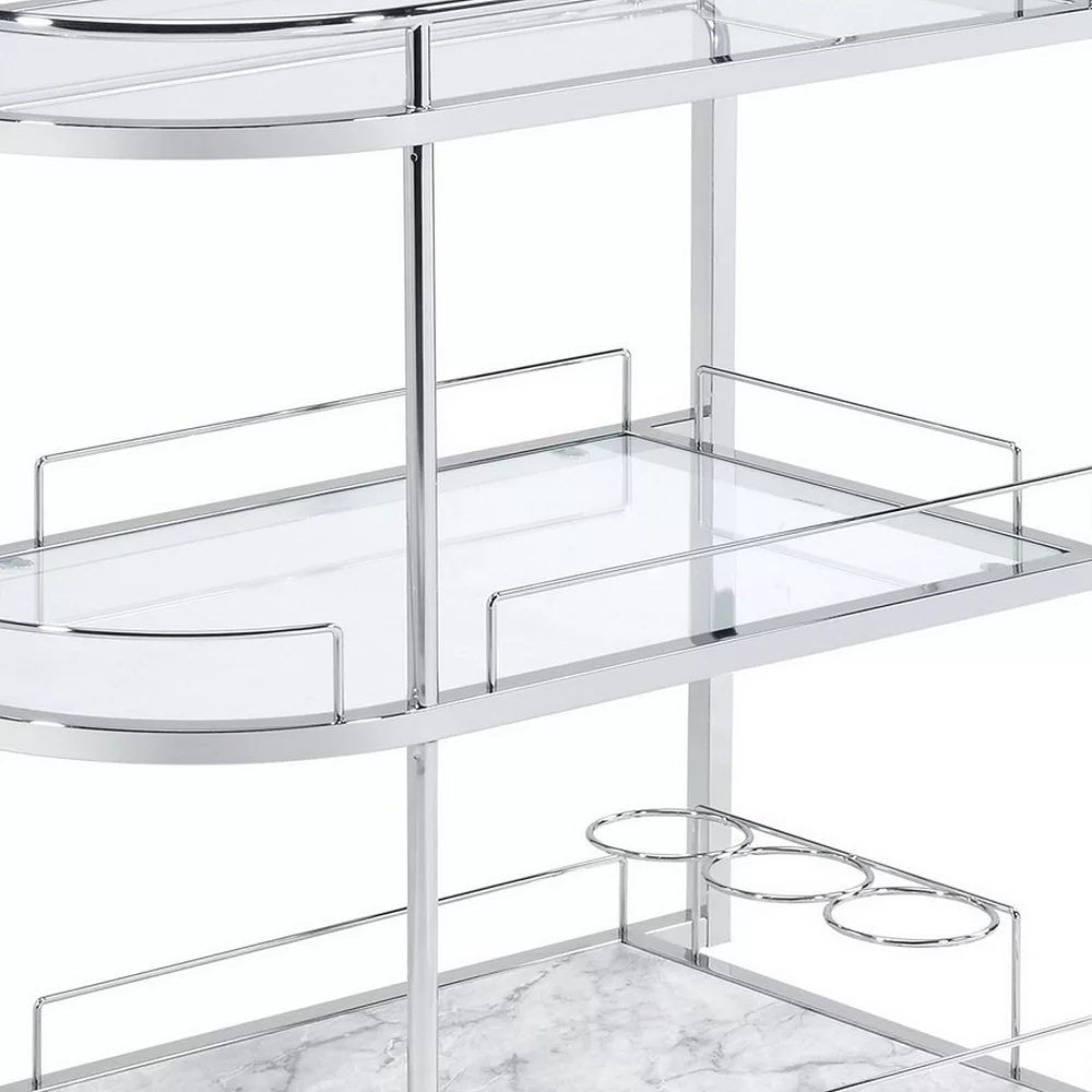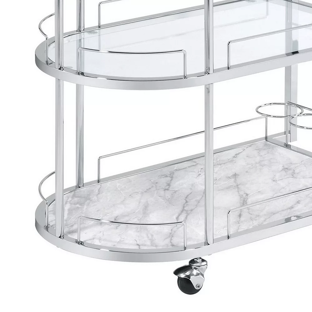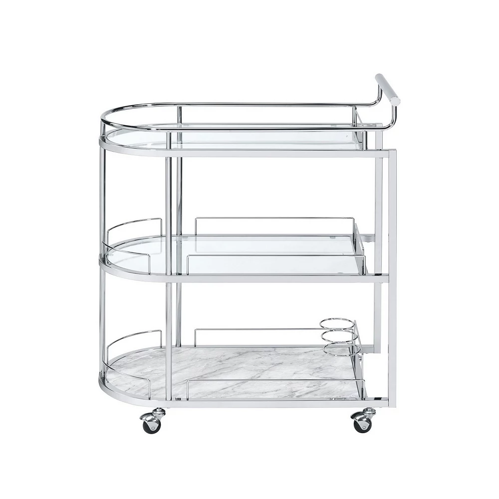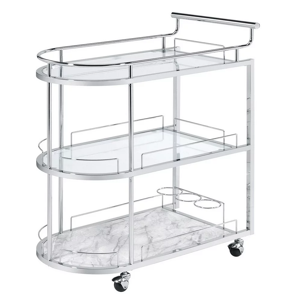 Serve your guests well with the inclusion of this serving cart. With an obround shaped silhouette, 5mm tempered glass shelves offer space to keep wine bottles, glasses, snack items, and other items. The bar handle facilitates mobility.