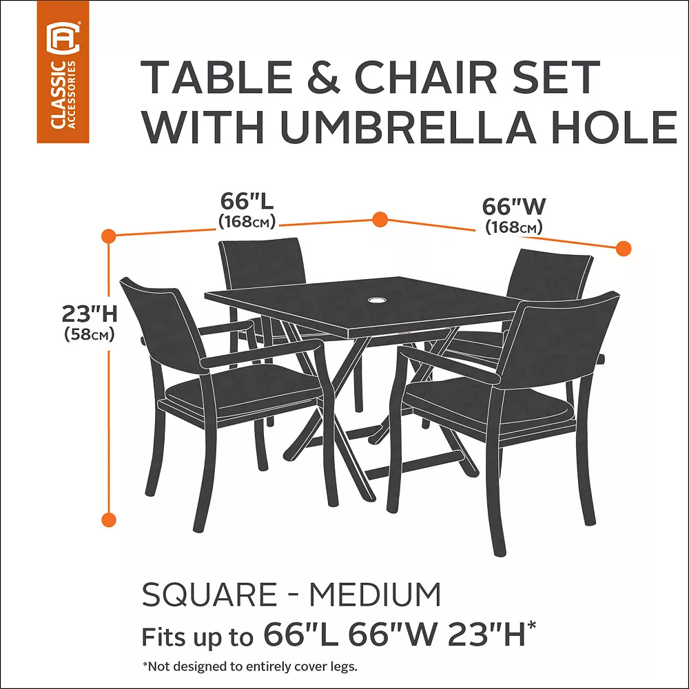 - Fits patio table with chairs up to 66”L x 66”W x 23″H