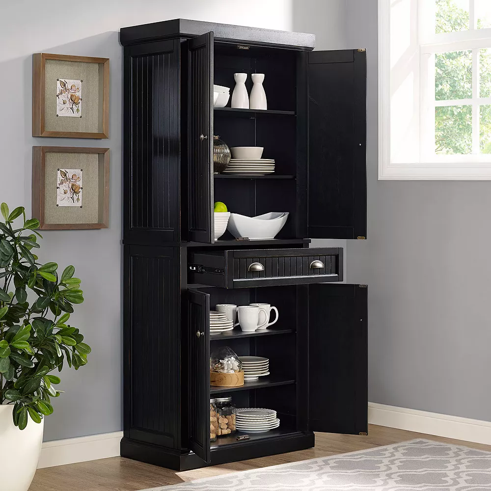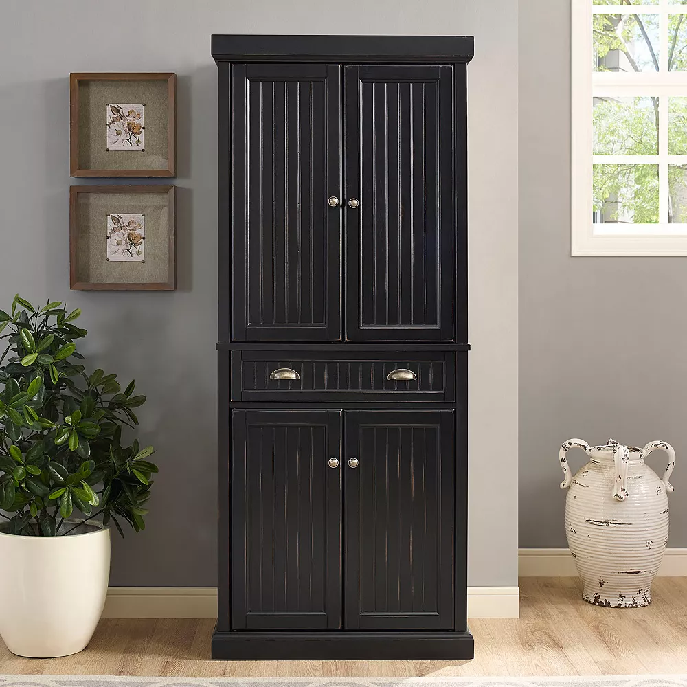This Crosley Furniture Seaside pantry storage cabinet features a weatd finish that’s sure to complement your kitchen or dining room decor.
