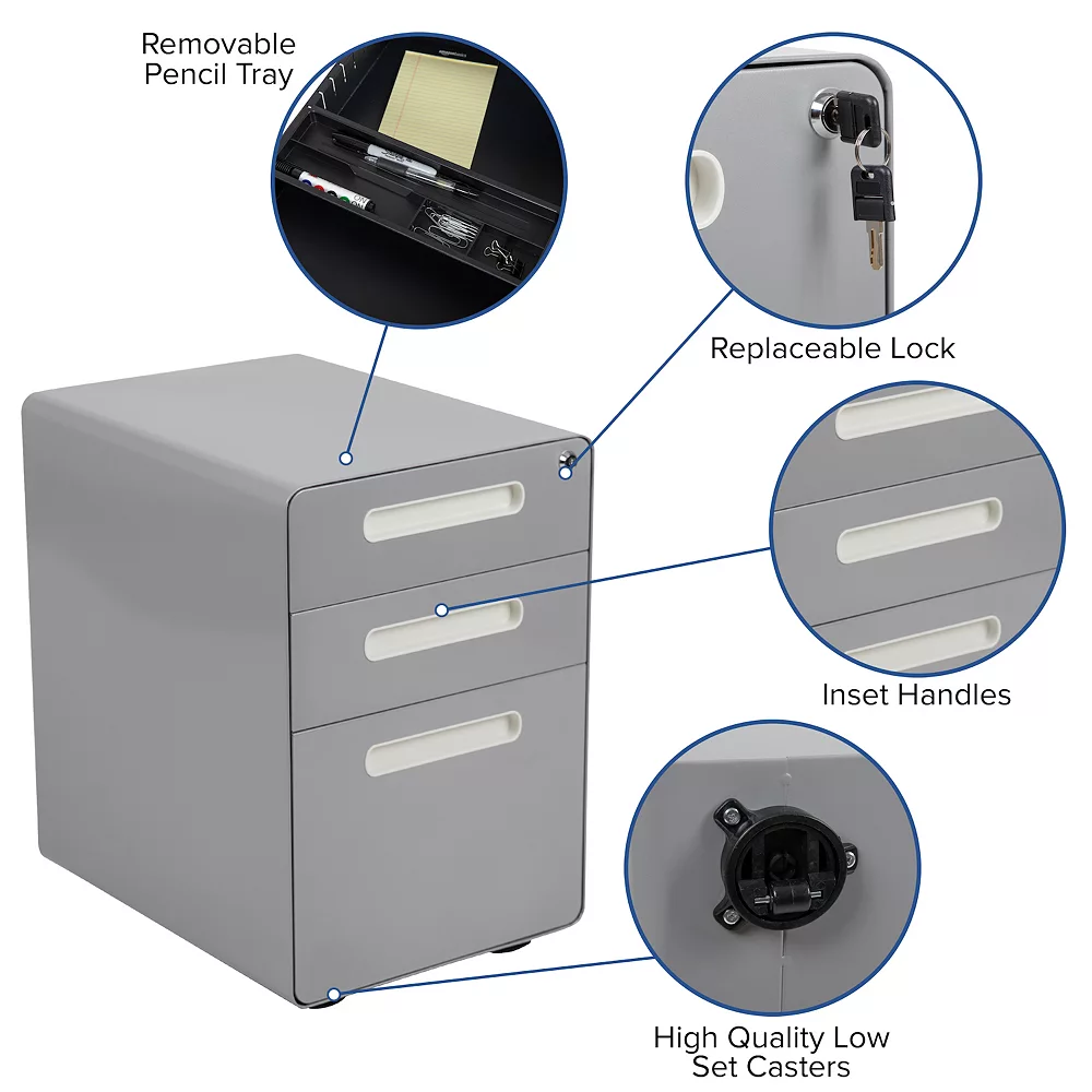 You may love your current desk but have nowhere to store your paperwork without cluttering the desktop, insert this locking file cabinet to keep the minimalistic appearance of your modern office desk. This 3-drawer pedestal file cabinet has low set casters to keep up with the needs of a busy worker. The convenience of casters is ideal for employees who regularly file documents, allowing them the option to pull the cabinet near them while monitoring incoming emails. The modern 3-drawer mobile file cabinet has two utility drawers to hold your small office supplies, snacks, vitamins and writing utensils while the hanging file drawer holds A4, letter, legal, and F4 hanging folders. Folder longer documents such as your legal size paperwork vertically using the conversion bar. An included pencil tray keeps your small supplies neatly stored and can be used in either of the two utility drawers. Two keys are included to keep in separate locations or as a duplicate for your assistant. Inset drawer handles provide a modern appearance and a worry-free solution to loosening handle screws. Organize your office space with this mobile under desk filing cabinet that comes fully assembled and ready-to-use. This ergonomic filing cabinet is a smart solution for any workplace whether used for heavy-duty daily filing or the casual user.