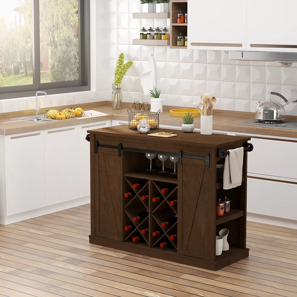 - SLIDING BARN DOORS: Adding a stylish touch, this island features cabinet doors with a sliding barn door look while providing access to both sides of the shelved storage space. The rustic wood grain of the kitchen server buffet matches most kitchen decors.