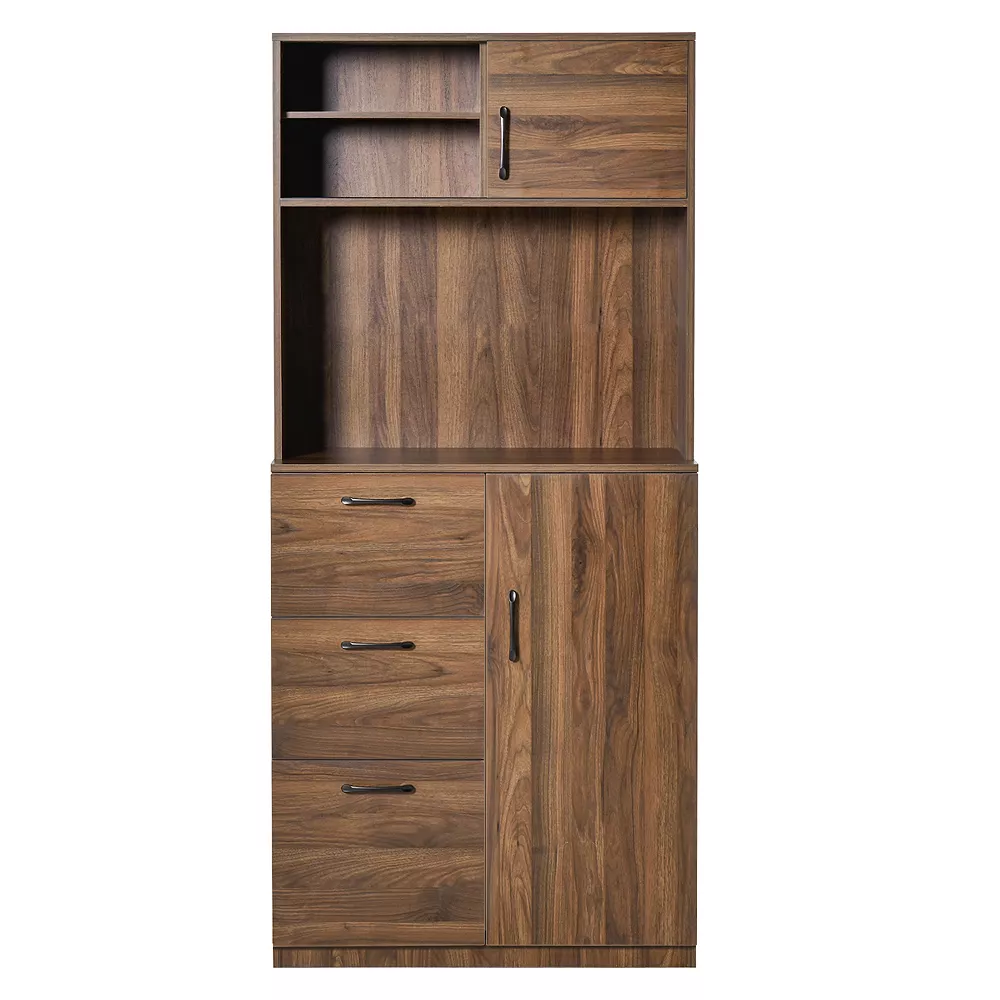 Add a stylish new storage option to your dining space with this HomCom kitchen pantry. This kitchen cabinet offers storage for dishes, table settings, and glasses with 3 drawers, and 2 cabinets with adjustable shelves. Place your microwave or other larger kitchen appliances in the open center or use as a display area for food dishes. If you have a retro style kitchen or dining room, this HomCom storage pantry will be a great accent piece with it’s distressed dark wood grain design. Upgrade your dining space today with HomCom.