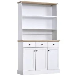 This kitchen corner pantry features a simple modern design and can be fit into various styles of decorations. It features 3 open shelves, 3 easy-glide utility drawers, a large hutch cabinet with bi-fold doors, and a single door cabinet. With its compact design and great storage capabilities, it will give you perfect usage experience.