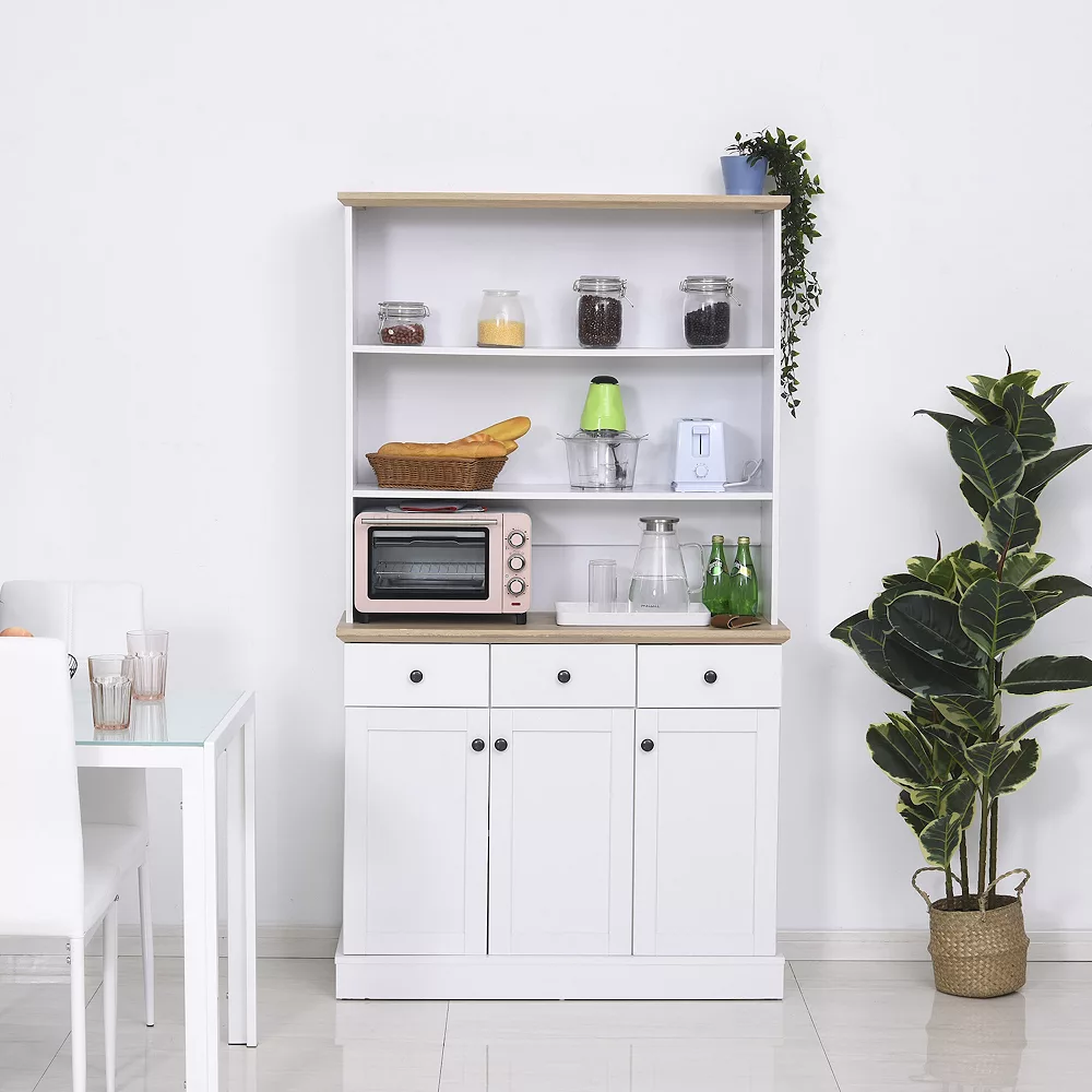 - SUFFICIENT SPACE FOR STORAGE AND DISPLAY: This kitchen cabinet storage features 3 open shelves for kitchen utensils and plates, 3 easy-glide utility drawers for small accessories, a large cabinet with bi-fold doors, and a single door cabinet for large supplies, each cabinet is equipped with 2 shelves.