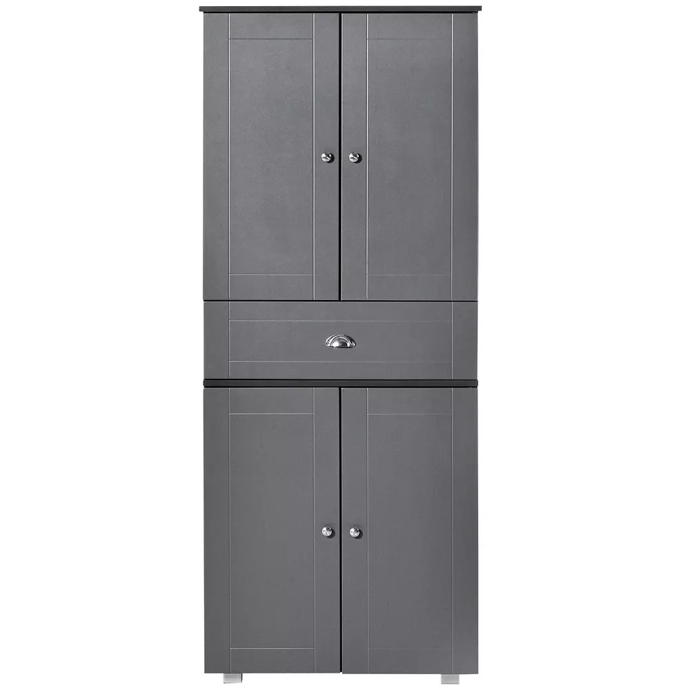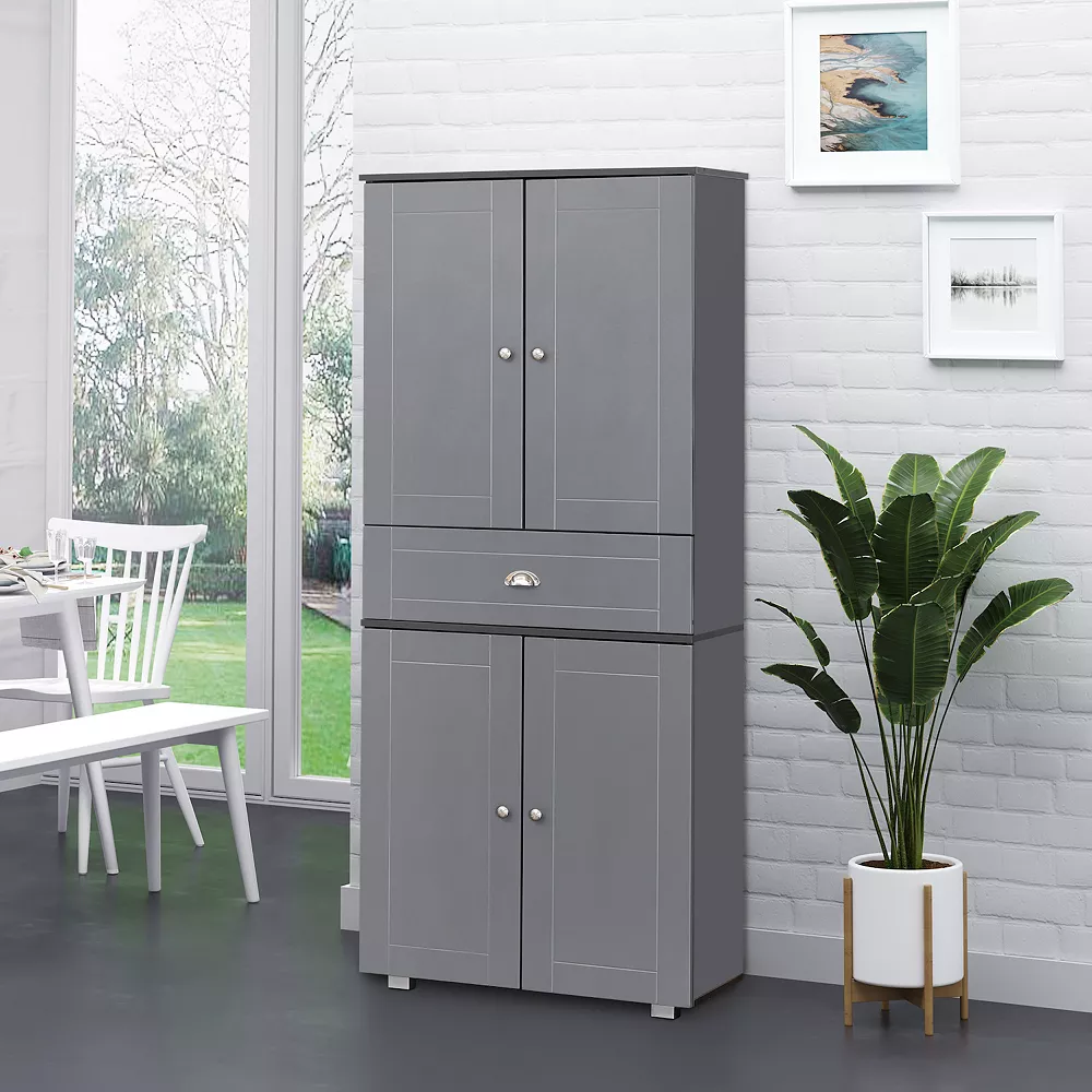 Organize your kitchenware and add more storage space with this kitchen pantry storage cabinet. You can utilize the 2 framed door cabinets to store plates, cereal boxes, or display collections/antiquities. The shelves are adjustable to fit any of your storage needs. Middle drawers can be used to place forks, knives, and napkins. Featuring unique blister door panels and aluminum hardware, this cupboard exudes charm and elegance. Elevate your home with HomCom.