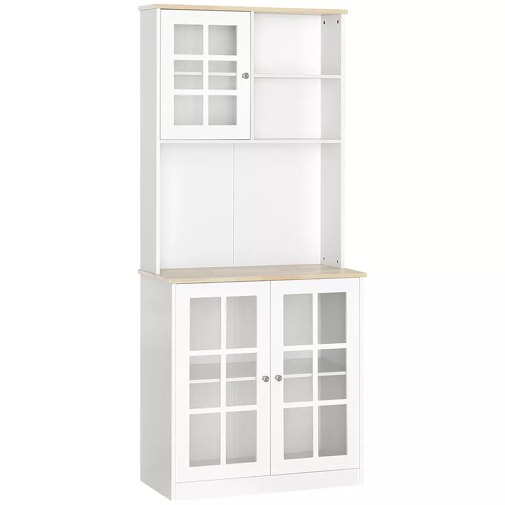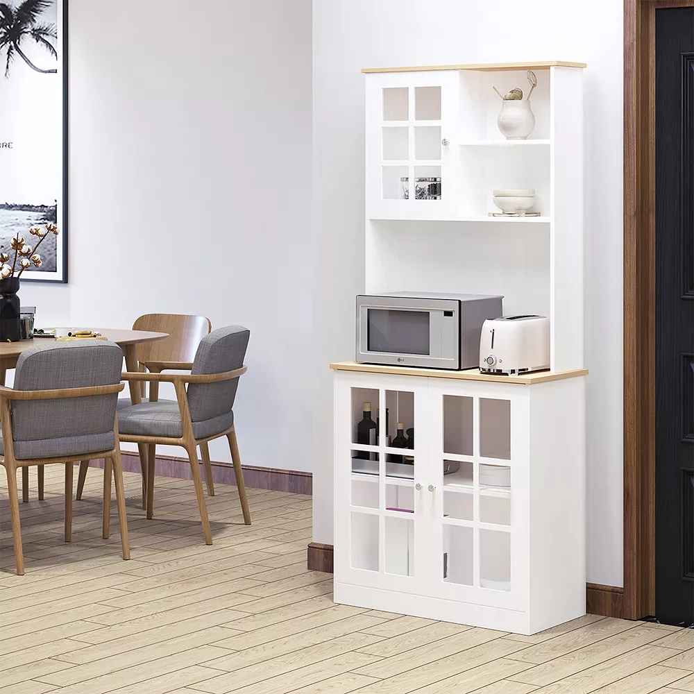 Want to add more brilliance to your house and keep the stuff organized for space-saving? Our HOMCOM kitchen hutch with windowpane doors can give you a neat space at home. Designed in a sleek style, it can fit in your kitchen, closet, garage, or bathroom. This cupboard features 2 cabinets, 1 open cupboard, and an open countertop shelf for versatile storage. The tempered glass doors make it convenient to identify your items. Just add this sideboard to enhance style and convenience with elegance.