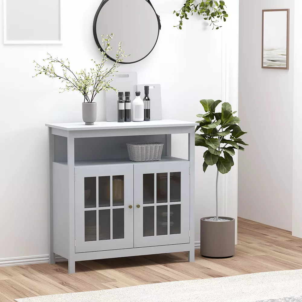 Ready to enhance your living or dining space? This buffet cabinet from HOMCOM is the upgrade you need. This kitchen sideboards has an open shelf to display plants, or keepsakes and 1 large cabinet to store dishes and glasses. The entryway cabinet is enclosed by 2 framed glass doors that add beauty to this storage cabinet. Also, you can adjust the shelves up or down to fit your storage needs. Use this buffet table with storage in your kitchen or hallway, and upgrade your style with HOMCOM.