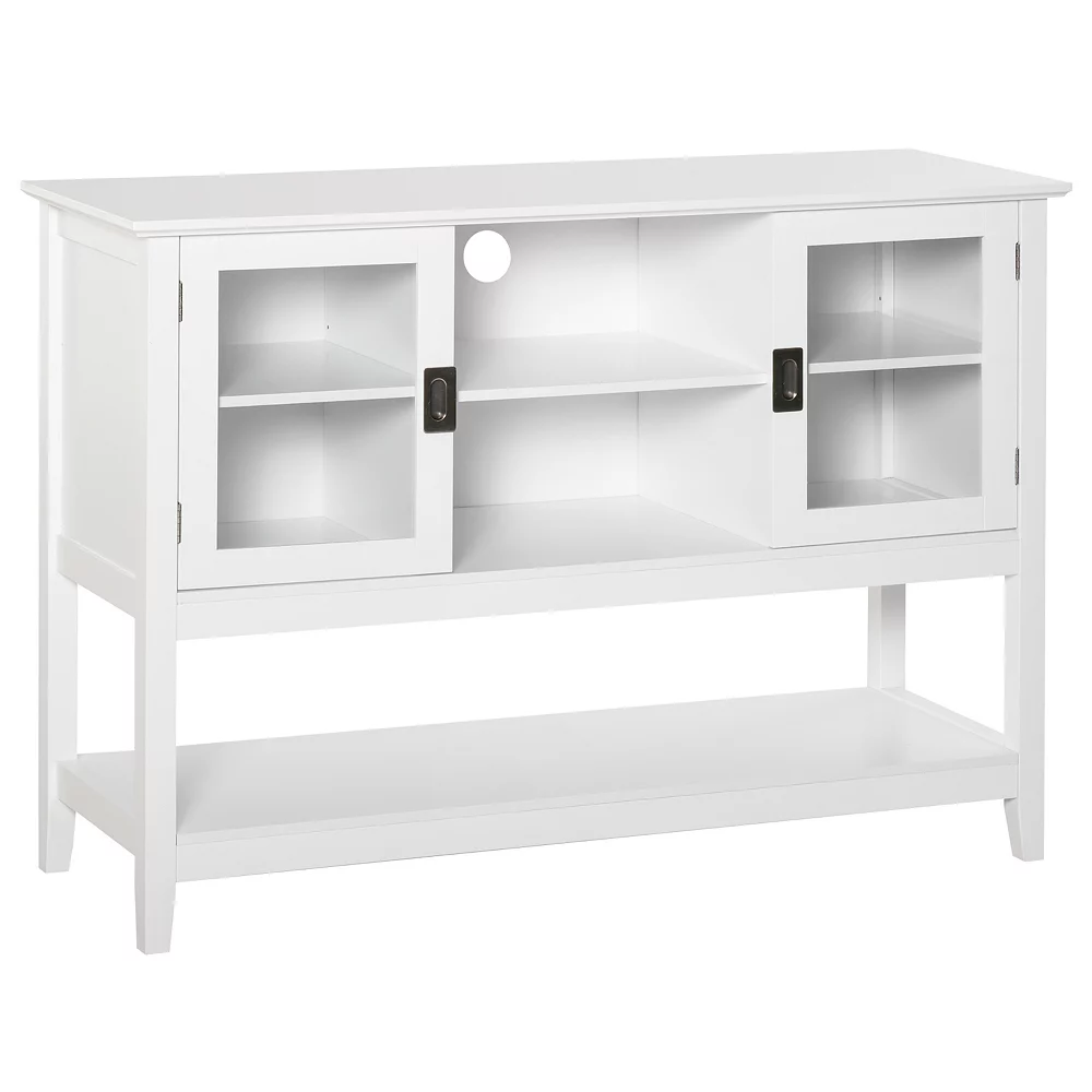 Ready to enhance your living space? Allow our sideboard cabinet to work for you. 2 framed glass doors bring elegance and classic to your home, allowing you to display decorative dishware or cherished keepsakes and keep out the dust. This kitchen storage cabinet features 2 enclosed cabinets and 2 open storage compartments, a spacious tabletop for kitchen appliances, and a bottom shelf for all your plates, jars, and utensils. Get the most out of your space with our buffet cabinet from HOMCOM.