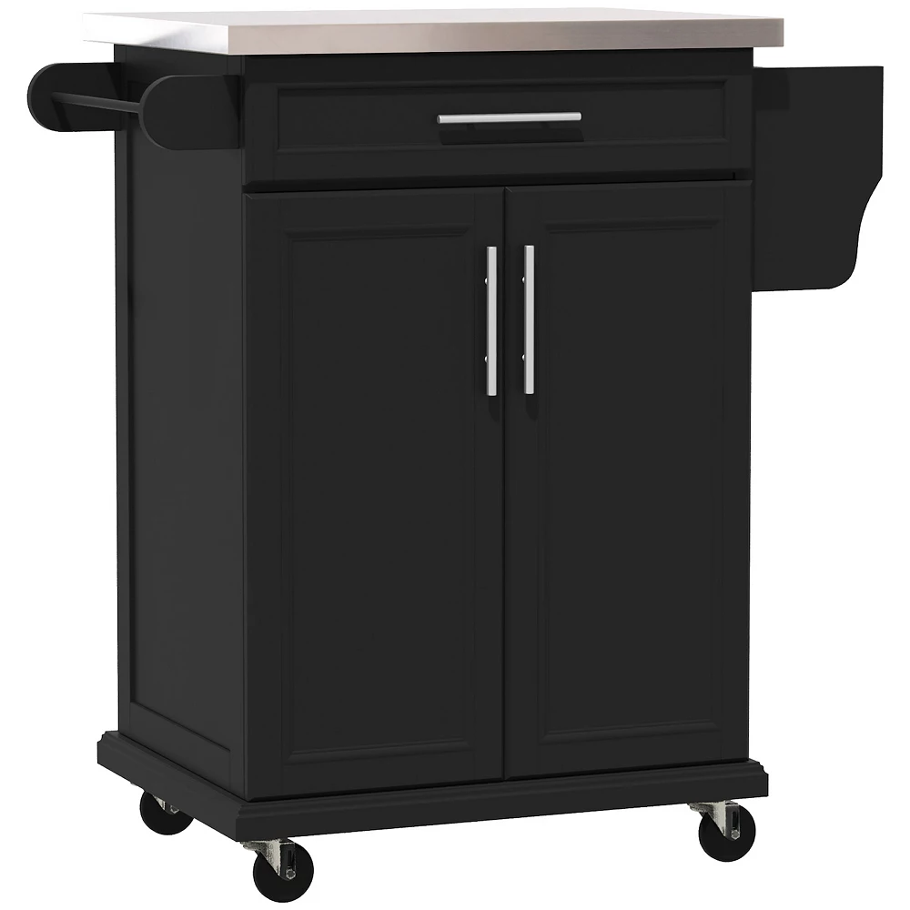 Add elegance and extra storage to your home with this rolling kitchen cabinet organizer from HOMCOM. Designed with functionality in mind, this compact kitchen island cart will make your life easier while adding taste and style to your home. The stylish and durable materials feature handsome pine wood with a solid stainless steel top for a sophisticated look which allows for placement and preparing of food and kitchen essentials. The drawers and cabinets can be used as a pantry or to store silverware, dishes, pots, pans, and more. A handy spice rack, towel rack, and wooden handle on the sides of the kitchen cart offer even more convenience and an effortless way to transport the cart. 4 rolling wheels provide smooth movement for when you’e working in the kitchen. Whether you want an additional work surface, to get better organized, or simply need a way to maximize your existing space, HomCom has got you covered with a stylish solution to your storage dilemma.