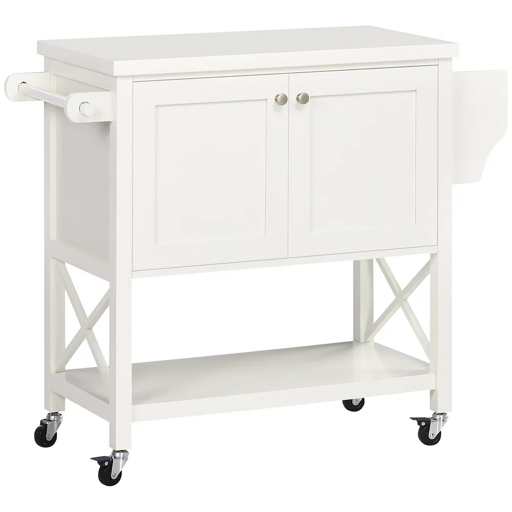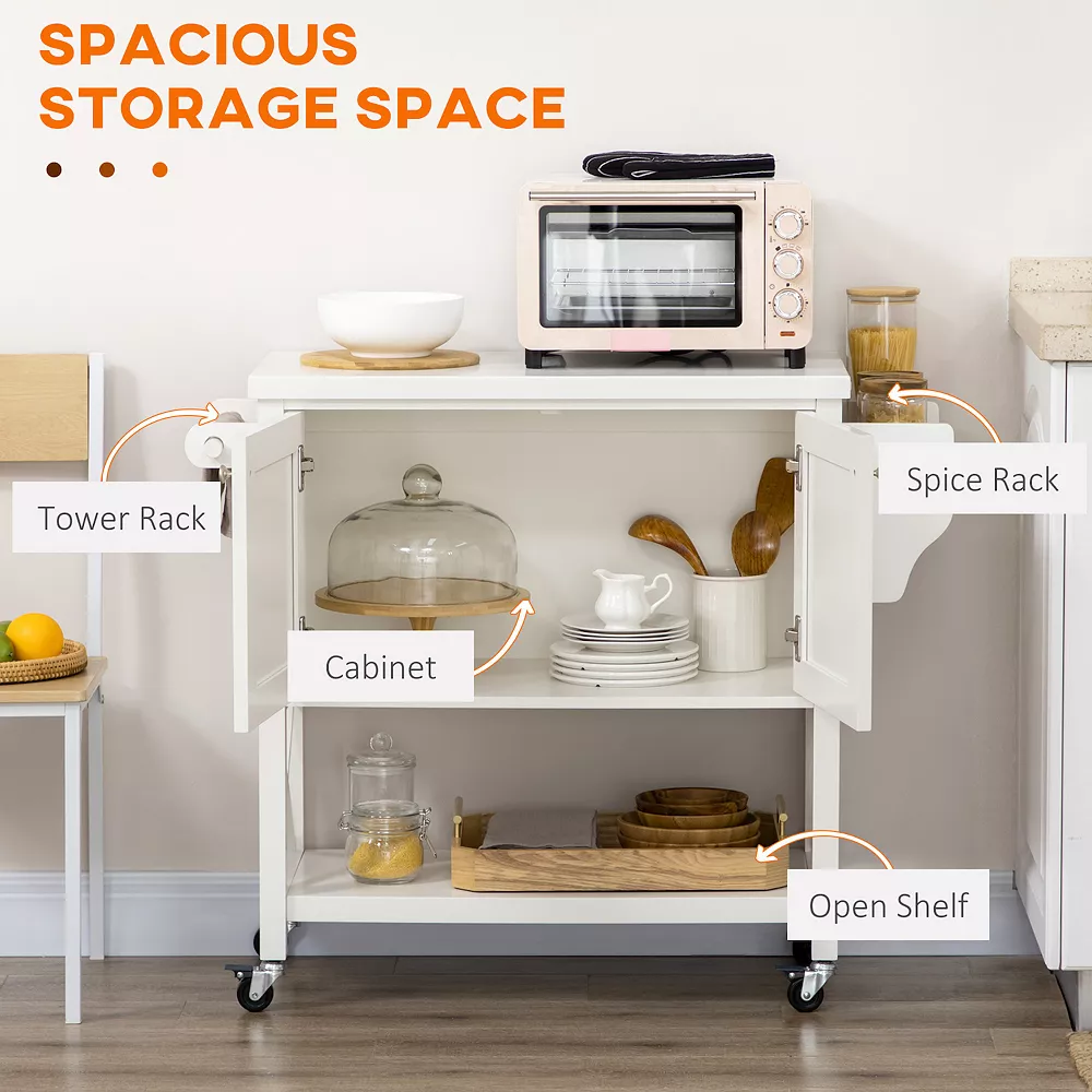 If you need some added storage in your kitchen for food prep, say hello to your kitchen’s new best friend. A double-door cabinet, an open shelf, a spice rack, and a towel rack provide ample space for supplies and accessories. Easy-roll wheels allow you to move wherever it is needed most. Store it away or use it as a microwave stand. Make your house a home with HOMCOM.