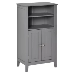 - ADD TO YOUR COLLECTION: This bathroom floor storage cabinet has a beautiful grey color and clean wood design to add to your current bathroom collection decor.