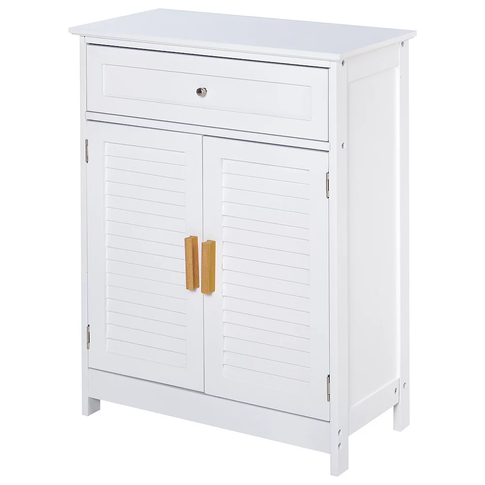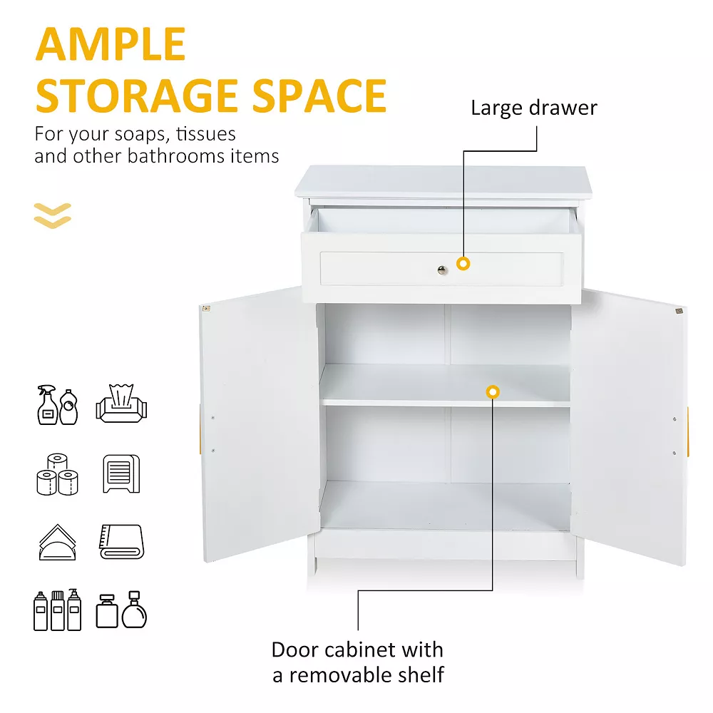 Expand the storage capacity in your bathroom with this bathroom cabinet from HOMCOM. Featuring a drawer, a removable shelf, and generous storage space, it can almost store all your bathroom essentials: soaps, towels, tissues, etc. Made of P2 grade MDF material and pinewood with a white surface, it is durable, natural and keeps the air fresh in your house. Also, it can function as a delicate decoration article in your house. The cabinet won’t take much room and can keep your bathroom clean and organized.