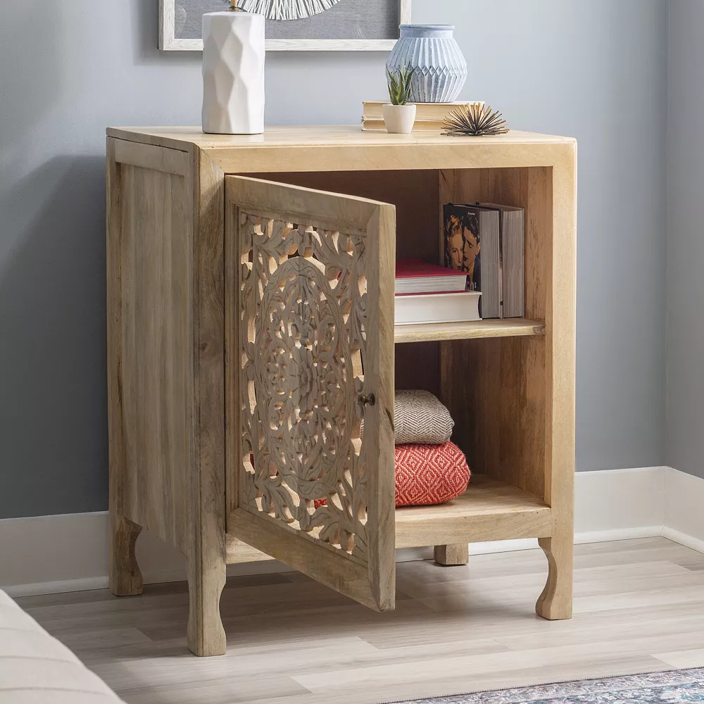 Keep your home both organized and stylish with this Linon Haven Carved Storage Cabinet.