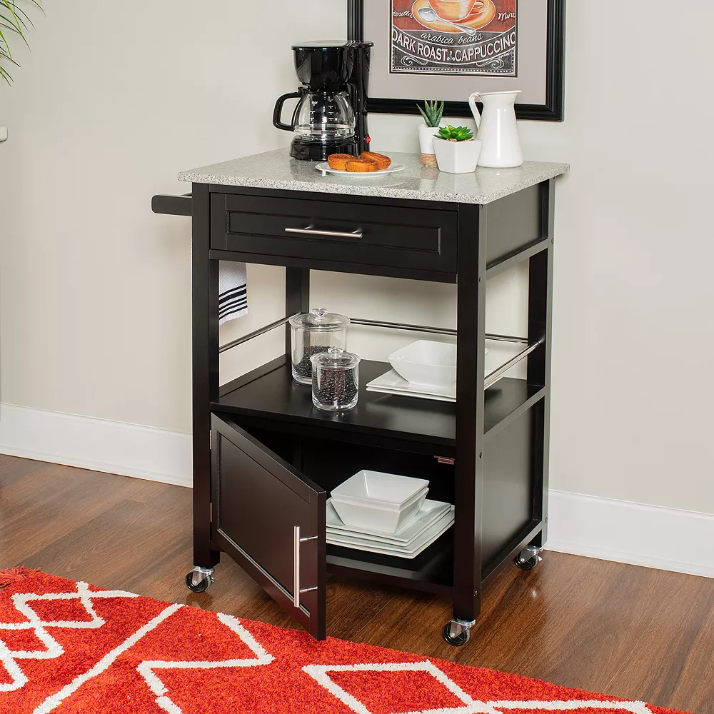 Condense your kitchen utensils, dishes and towels into one handy cart with this Linon Black Kitchen Cart featuring a granite top that can double as a prep area!