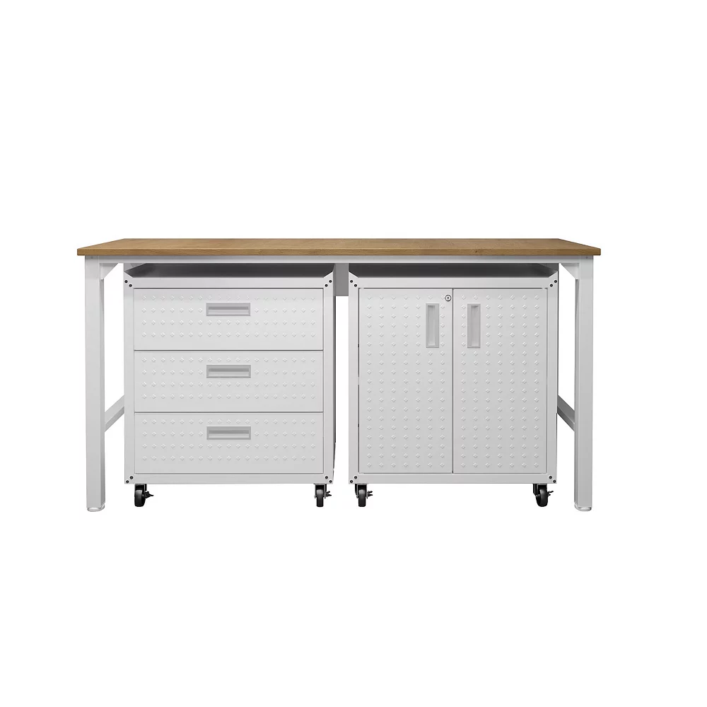 - Mobile cabinets also feature a space saving design as they fit perfectly under the Fortress Garage Table included in this set.