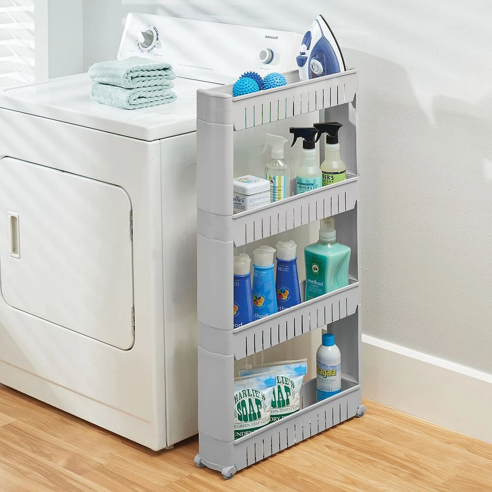 Take the hassle out of laundry day with the mDesign Portable Three Shelf Rolling Laundry Utility Cart. Three shelves store dryer sheets, laundry detergent, stain remover, irons, spray starch, fabric softener and more in one convenient spot. The narrow design fits in between washers and dryers for compact storage in small or crowded laundry rooms. Use in the laundry room, bedroom, or dorm room to make laundry day a breeze!