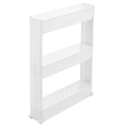Take the hassle out of laundry day with the mDesign Portable Three Shelf Rolling Laundry Utility Cart. Three shelves store dryer sheets, laundry detergent, stain remover, irons, spray starch, fabric softener and more in one convenient spot. The narrow design fits in between washers and dryers for compact storage in small or crowded laundry rooms. Use in the laundry room, bedroom, or dorm room to make laundry day a breeze!