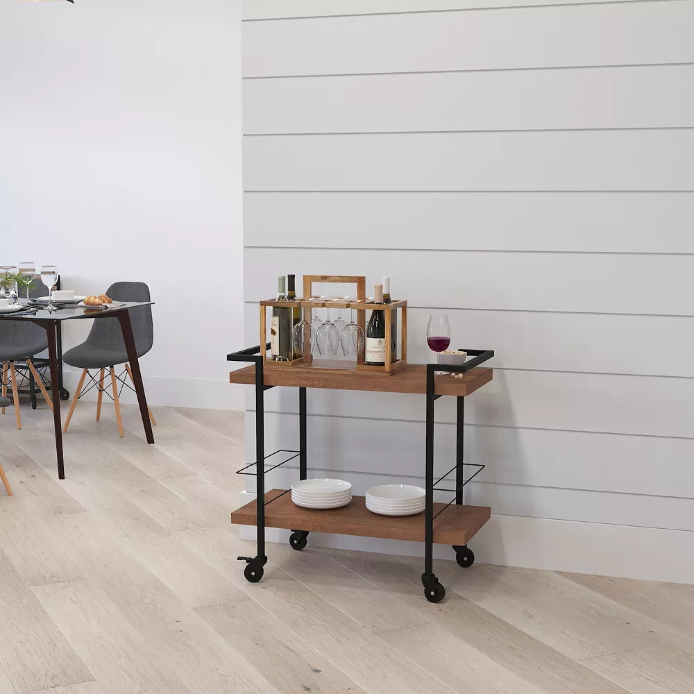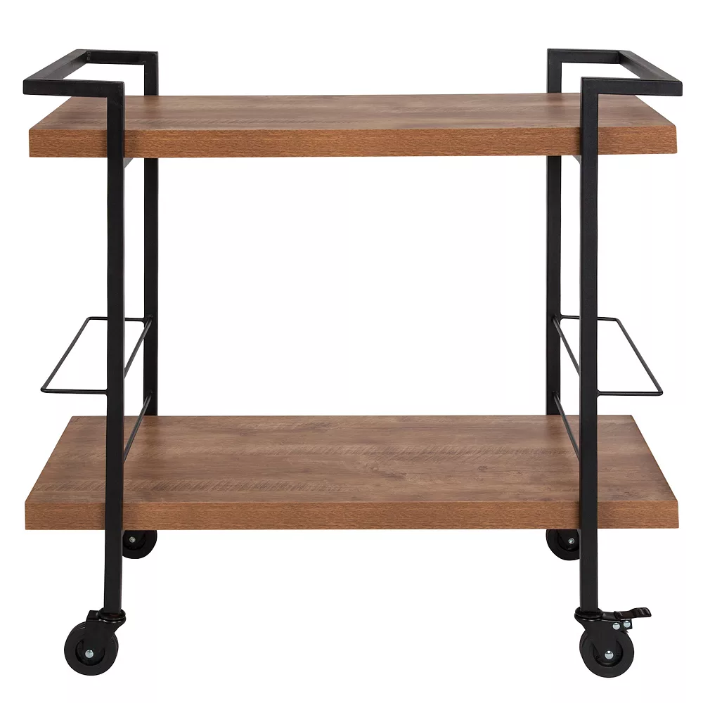 With a style that can be described as industrial modern and functionality that appeals to 21st century needs, this bar cart is ideally suited for today, tomorrow and beyond. Laminate wood grain is contrasted by the agile iron frame and legs equipped with 3.5 swivel casters to protect flooring. Thoughtfully designed with two wine racks that combine to hold up to six bottles, this rustic contemporary bar cart is ready to serve in the new age.
