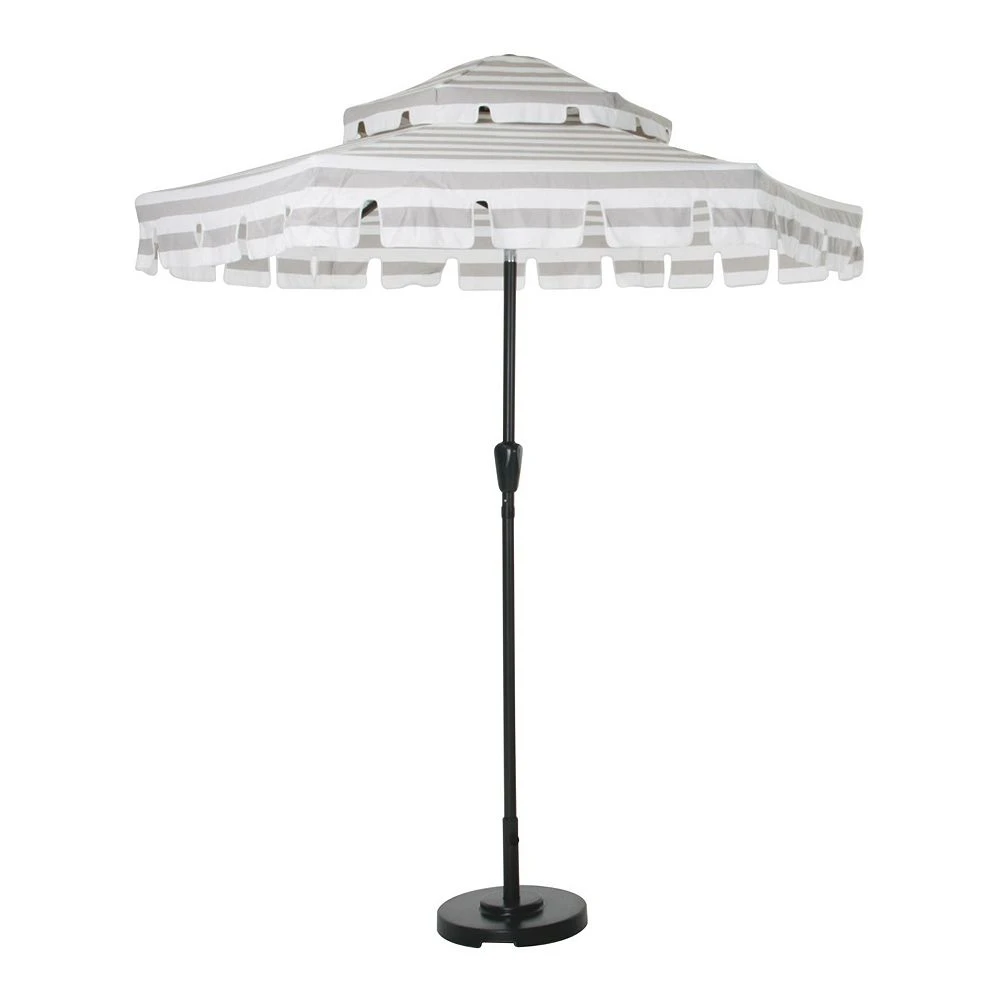 - 2-tier umbrella with bold grey and white stripes on a scalloped edge