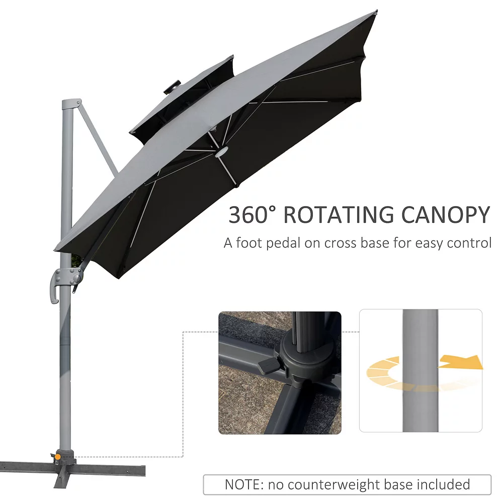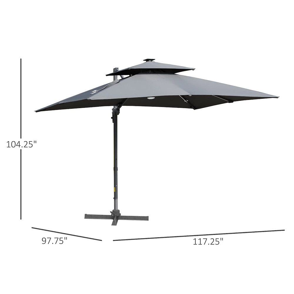 Enjoy shade in the day and beautiful illumination at night. Welcome this offset patio umbrella with solar lights from Outsunny into your home to transform your garden memories. With LED lights scattered on the support ribs, controlled by a switch: you can radiate your outdoors at night. The large polyester canopy can be adjusted to 4 different angles and swivels 360°, so it can provide shade at any angle. The led umbrella is fitted with a crank handle to open and close the canopy easily.