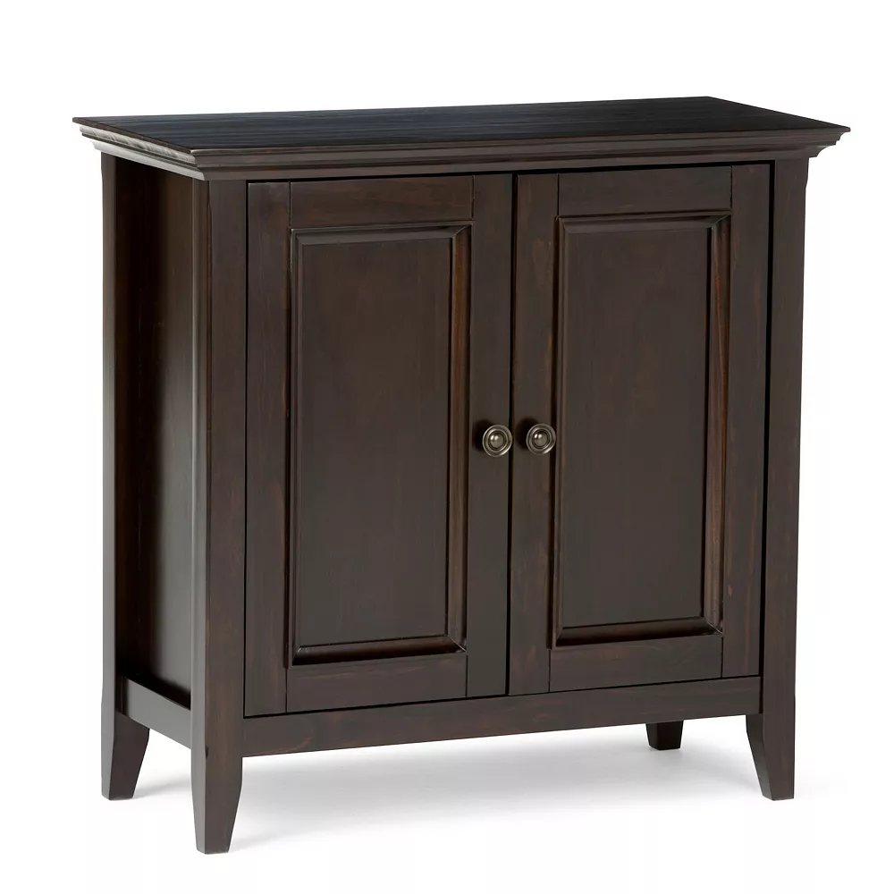 Upgrade your storage game with the classy Simpli Home Amherst Transitional Low Storage Cabinet.