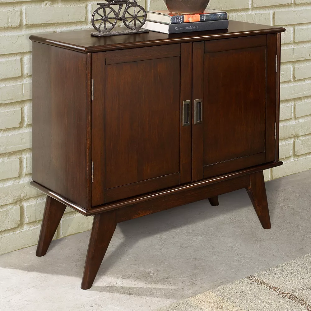 Store your dinnerware in style with this charming Simpli Home Draper mid-century storage cabinet.