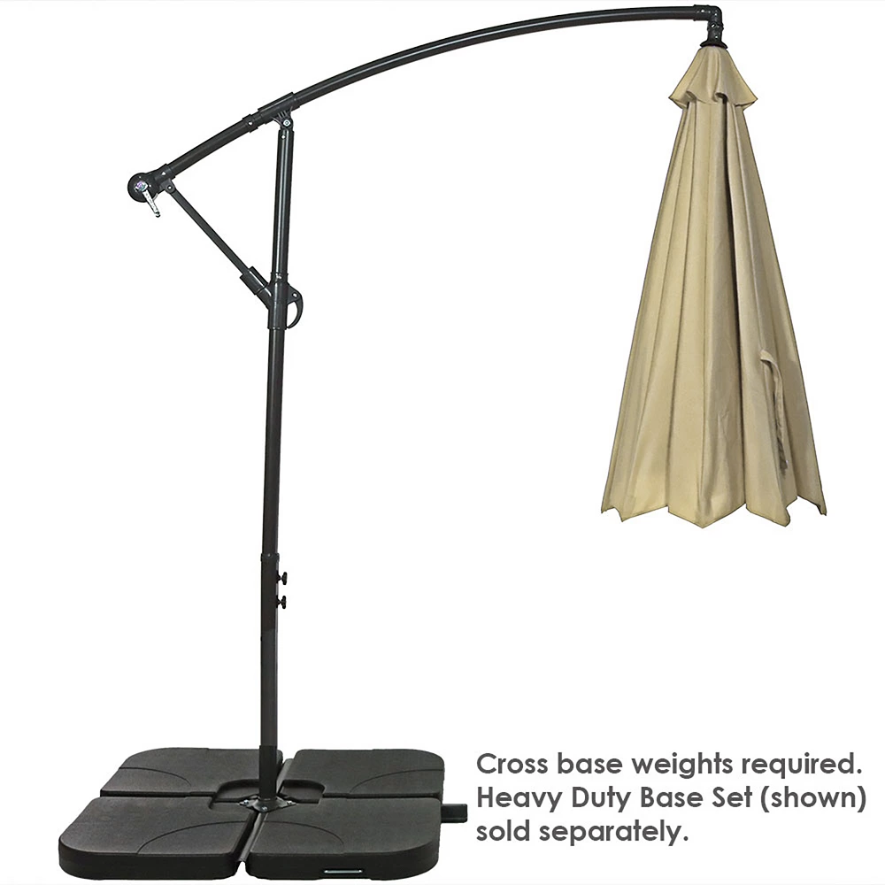 - VERSATILE OPTIONS FOR BASES: Please note, a heavy base is necessary (not included). Secure the cross base with 120 lbs. Some options include four 30 lb paving stones or concrete weights (not included) or a heavy-duty water/sand umbrella base (sold separately). Place the large umbrella on the deck, porch, backyard, garden, or by the pool. Place it near your patio furniture with the overhanging cantilevered design.