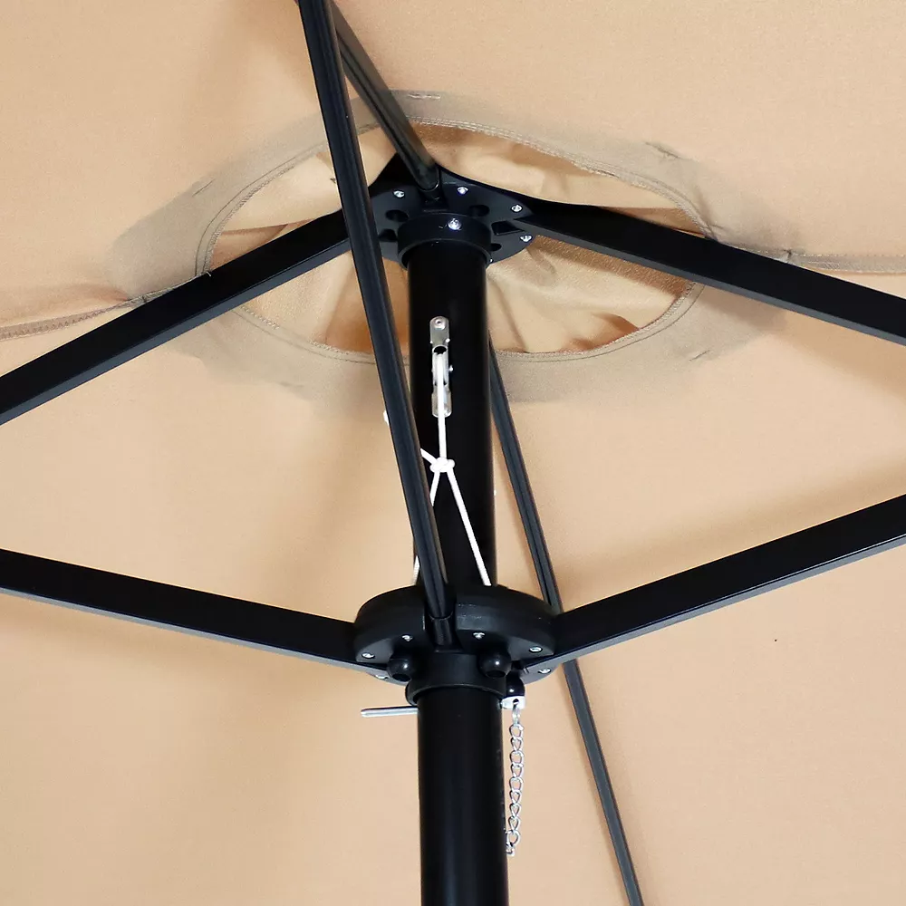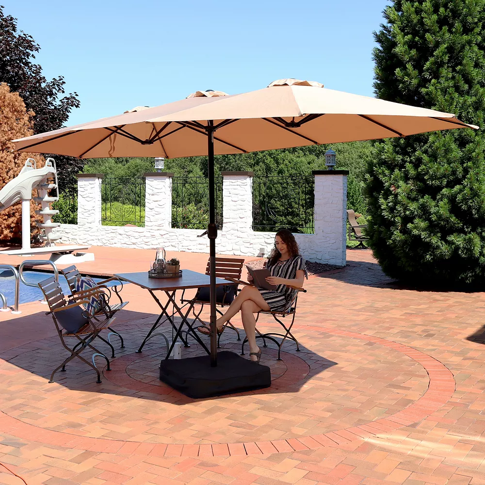 Create a cool and shady spot on the patio or in the backyard with this double-sided, outdoor patio umbrella with an included sandbag base. Constructed of waterproof polyester, the umbrella canopy is designed to be durable to hold up to the elements year after year. The umbrella is held together by a durable steel base and pole that provide a sturdy frame for resistance to harsh wind. Ensure that this large outdoor market umbrella stays firmly in place with the included 2-piece sandbag. Simply fill each sandbag with 99 lbs of sand, place at the base of the umbrella, and the umbrella is ready to use (please note, sand is not included with this product and must be provided separately). Great for parties and large gatherings, this outdoor must-have will make a welcome addition next to the pool, on the deck, or other places you can enjoy cool shade on a hot summer day.
