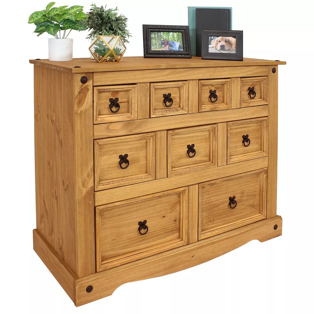 Add sophisticated style and convenient storage to any room in the home with this beautiful chest of drawers. Constructed from solid pine, this sturdy piece of furniture features elegant, molded detailing and zinc alloy drawer pulls for an antique-inspired appearance. Plus, it features steel drawer slides to smoothly open and close the drawers. This farmhouse storage chest has 9 rustic drawers in 3 unique sizes. Each drawer in the top and middle rows have a weight capacity of 20 lbs while each drawer in the bottom row has a 30 lb weight capacity. The different drawer sizes provide useful organization for a variety of items. It’s great for storing jewelry, sewing and craft supplies, silverware, napkin rings, linens, and much more. The flat top of the chest also provides a useful spot to display items. Place this chest of drawers in the living room, dining room, or office to complete the decor.