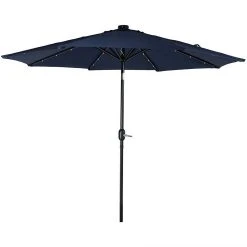 This solar patio umbrella has everything needed to enjoy time outdoors and out of the sun. The tilt and crank functionality can conveniently position the umbrella at the perfect angle, easily close and open it. The umbrella features a solar panel located at the top of the umbrella that powers the 24 LED lights located on the steel ribs making socializing or relaxing under the umbrella day or night much easier. The lights operate via a switch on the upper crank housing. When fully charged via solar power, the lights will last 8-10 hours! The large 9-foot umbrella diameter makes it the perfect size for any 42 – 54-inch outdoor dining table and chairs. With a standard 1.5-inch opening base, use the umbrella with any favorite outdoor seating set! In addition, the umbrella is engineered to last with a black powder-coated aluminum pole for resistance to rust, steel ribs for maximum support and 100% polyester fabric for the umbrella for extra durability.