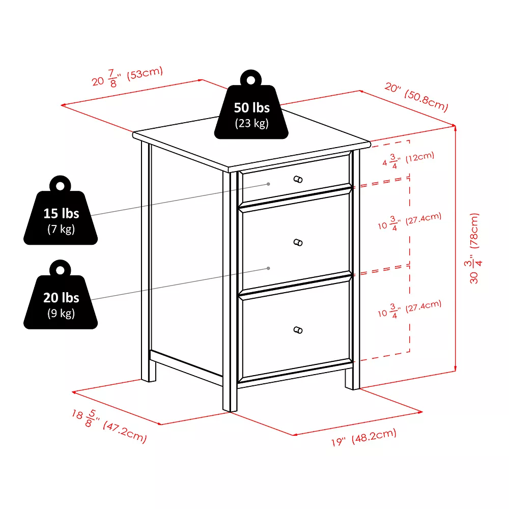 - Two file drawers: 9.8″H x 14.8″W x 16.1″D